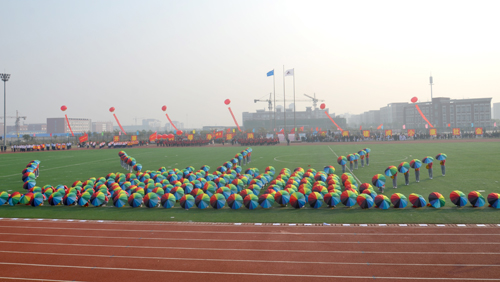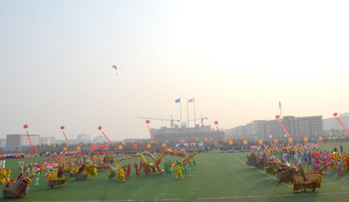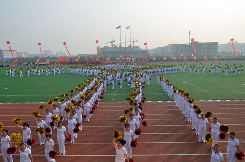 开幕式前,2000多名来自全市乡镇、社区、市直机关、企业、学校的各界群众进行了大型文体表演。文体表演分为龙腾奋飞、英姿流韵、青春飞扬、激情奋进和走向未来五个篇章。在走向未来部分,我院学生表演了大型团体操,她们踏着欢快的节拍、舞动青春的旋律,用手中的七彩雨伞呈现出“海滨缩写”、“旋动风车”、“奥运五环”、“旭日东升”等图形图案,为全场观众带来了一幕幕震撼人心的视觉盛宴。