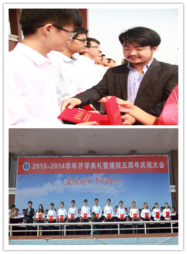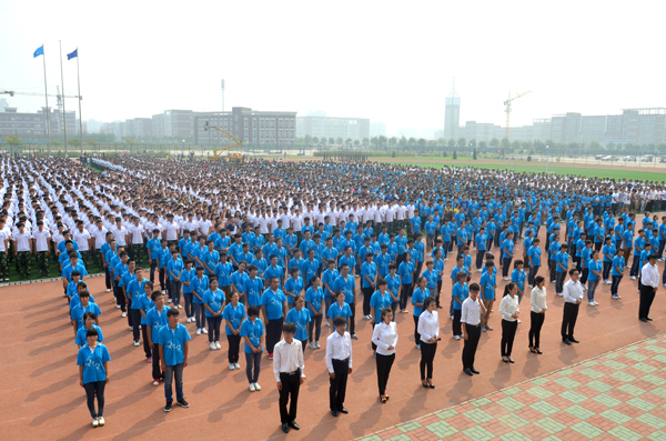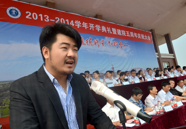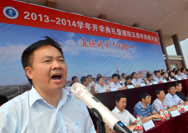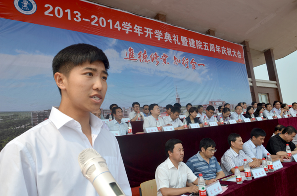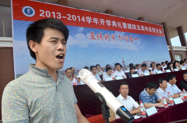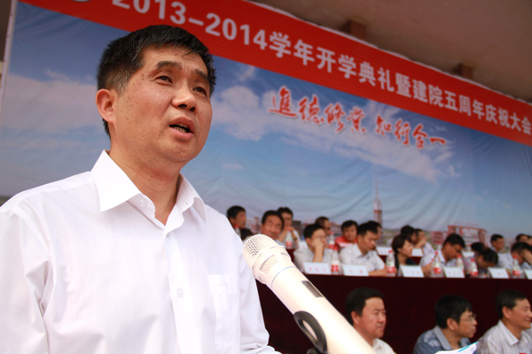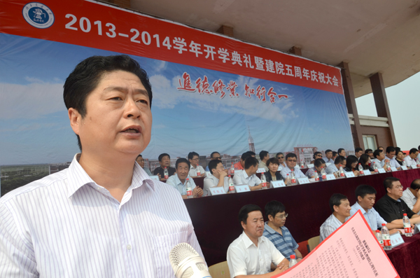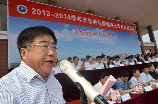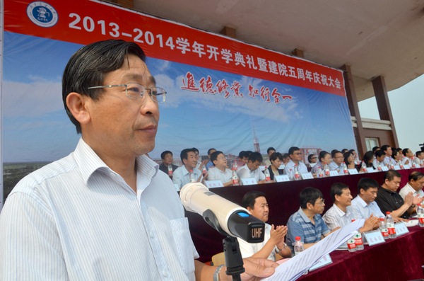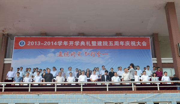 9月7日上午,我院2013-2014学年开学典礼暨建院五周年庆祝大会在学院体育场隆重举行。365英国上市网站官网校长宁滨,365英国上市网站官网党委副书记、我院院长高福廷,沧州渤海新区管委会副主任、黄骅市政府市长潘海瀛,祥兴集团副总经理、海滨学院董事薛君南,黄骅市政府副市长郑增强,365英国上市网站官网各学院及职能部处负责人,华城公司负责人及校企合作企业的代表等领导和嘉宾出席大会并在主席台前排就坐。我院全体领导、各系部处室负责人、全体教职员工以及万余名在校生参加大会。大会由我院执行院长王大勇主持。
