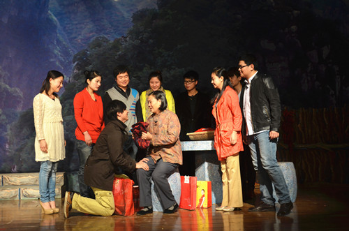 演出结束后,吴子成副院长代表学院为剧组赠送了锦旗。院领导上台与剧组全体人员亲切握手并合影留念。