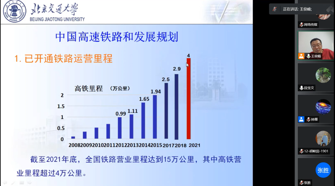 讲座过程中,王俊峰教授通过中国的具体规划详细地介绍了构建交通运输创新体系和交通运输安全发展体系,并讲述了中国高速铁路和发展规划。