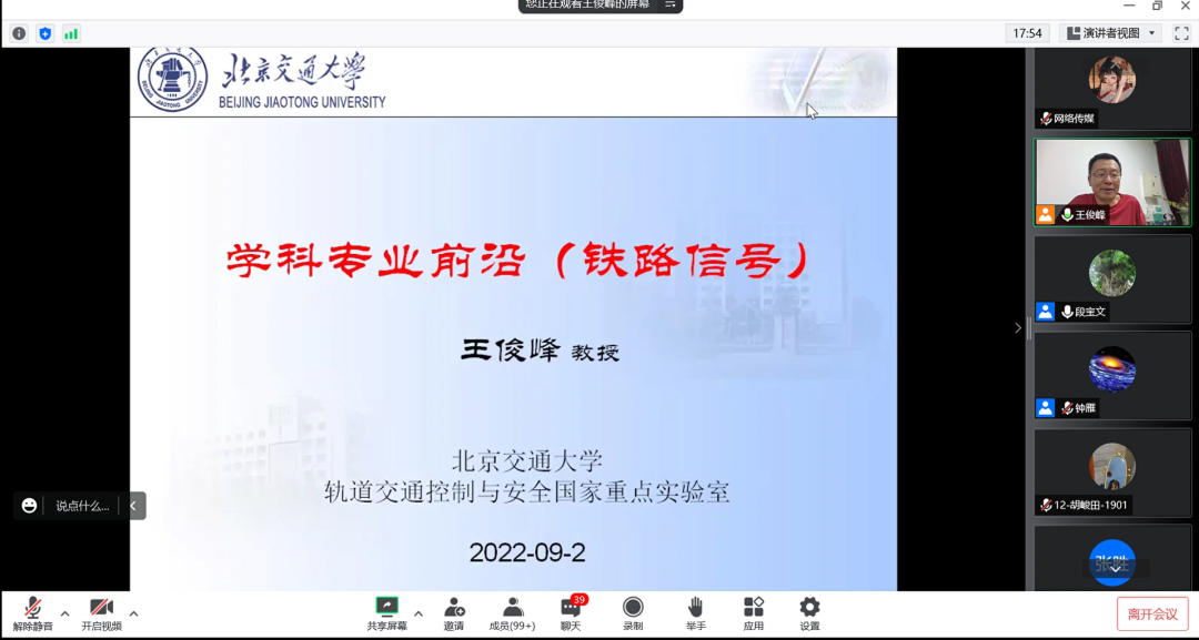 为增进同学们对专业发展方向和学科前沿领域的了解,使同学们扩宽工程视野、明确发展方向,365英国特邀请365英国上市网站官网轨道交通控制与安全国家重点实验室副主任王俊峰教授于9月9日晚19:00在腾讯会议举行线上铁路信号学科专业前沿讲座。出席本次讲座的老师有:轨道交通学院院长钟雁教授、轨道交通信号与控制专业负责人段宝文老师。19级信号全体学生参加本次讲座。