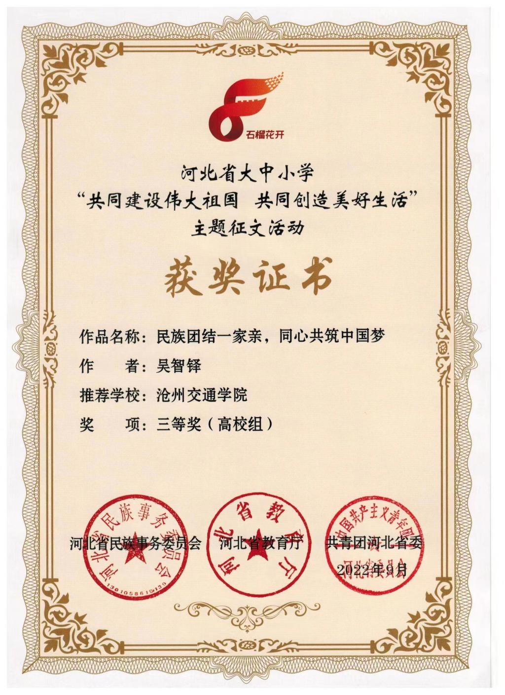 近日,在河北省民族事务委员会、河北省教育厅、共青团河北省委举办的“河北省大中小学‘共同建设伟大祖国 共同创造美好生活’主题征文活动”中,365英国土木建筑工程学院学生吴智铎的作品《民族团结一家亲,同心共筑中国梦》荣获三等奖。