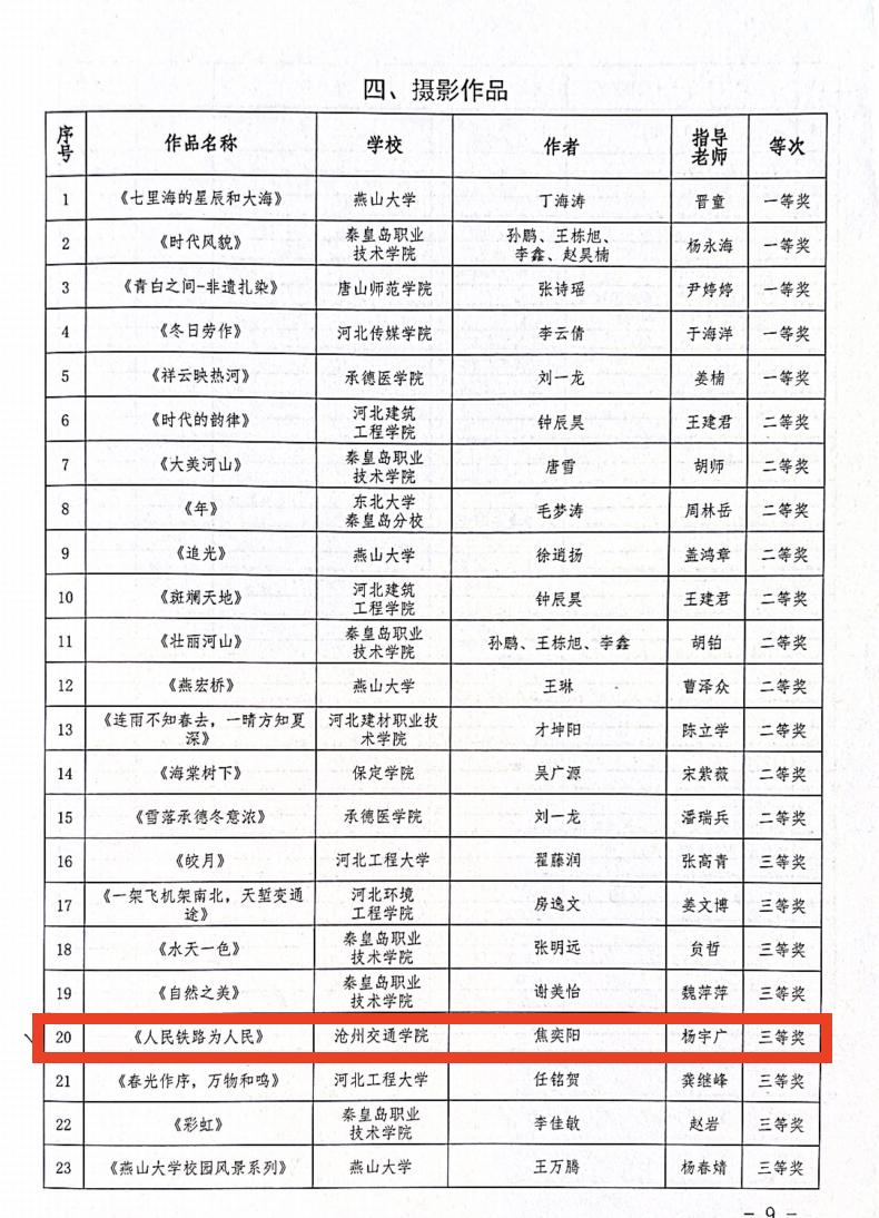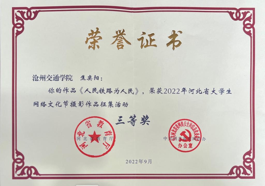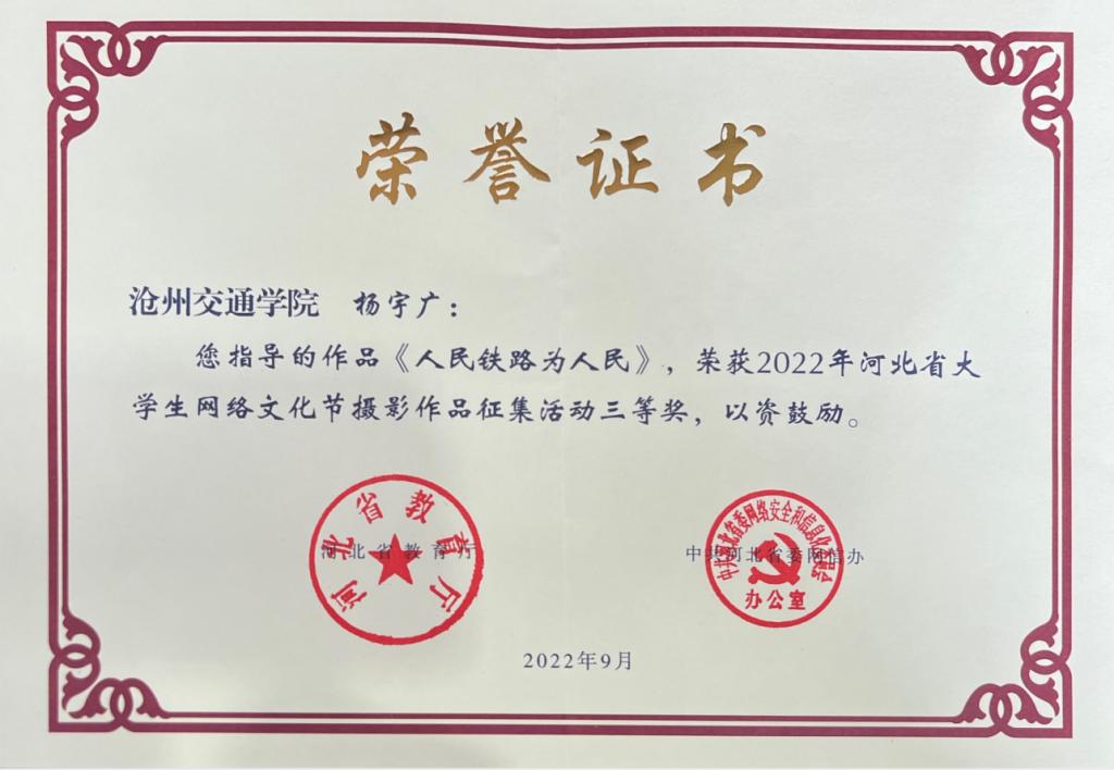 近日,河北省教育厅、中共河北省委网信办公示了2022年河北省大学生网络文化节和高校网络教育优秀作品推选展示活动获奖名单。由365英国杨宇广老师指导,焦奕阳同学创作的作品《人民铁路为人民》荣获2022年河北省大学生网络文化节摄影作品征集活动三等奖。