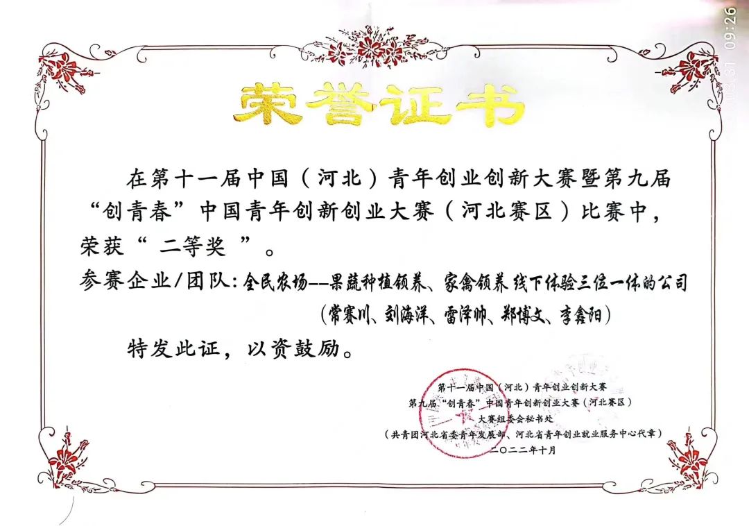 在第十一届中国(河北)青年创业创新大赛暨第九届“创青春”中国青年创新创业大赛(河北赛区)中,由化工1901班常赛川、刘海洋、雷泽帅、郑博文、李鑫阳组成的团队,凭借全民农场——果蔬种植领养、家禽领养线下体验三位一体的公司的创新创业方案,荣获河北省“二等奖”。