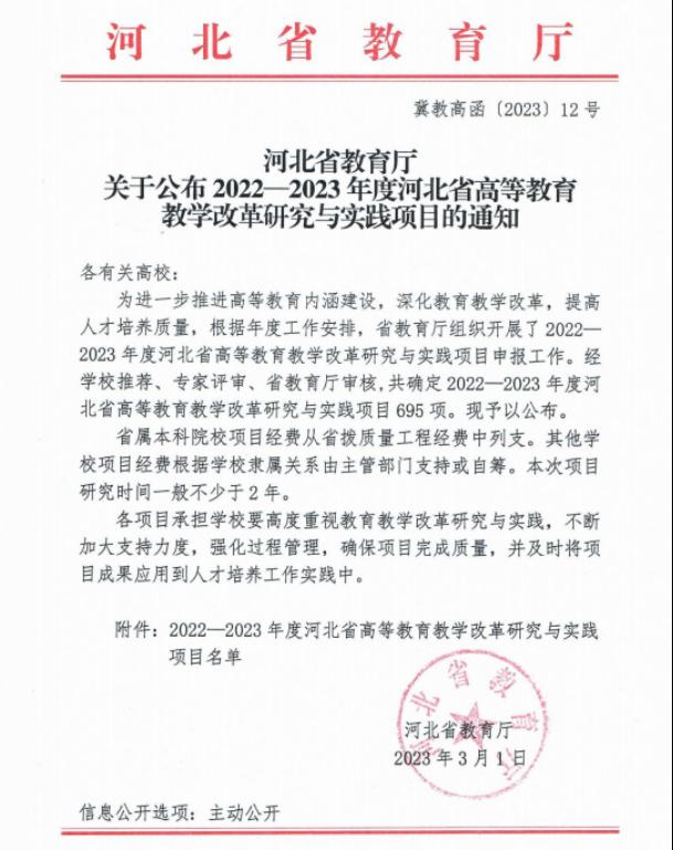 近日,河北省教育厅公布了2022-2023年度河北省高等教育教学改革研究与实践项目名单,365英国共有4项教育教学改革研究与实践项目获批立项。