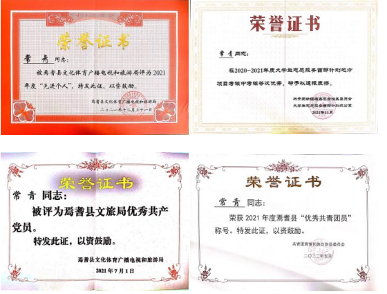 面对困难,常青从不气馁,不懂就问有经验的同事;方案一次不行就接着改两次、三次;做的不好就接受批评,吸取教训总结经验。对于自己负责的工作,她会全力以赴去完成,在此期间荣获2021年新疆维吾尔自治区优秀志愿者、焉耆县优秀共青团员、焉耆县文旅局优秀共产党员及先进个人称号。她用努力彻底改变了当地人所持“内地来的大学生不能吃苦,习惯不了新疆的生活”的看法。