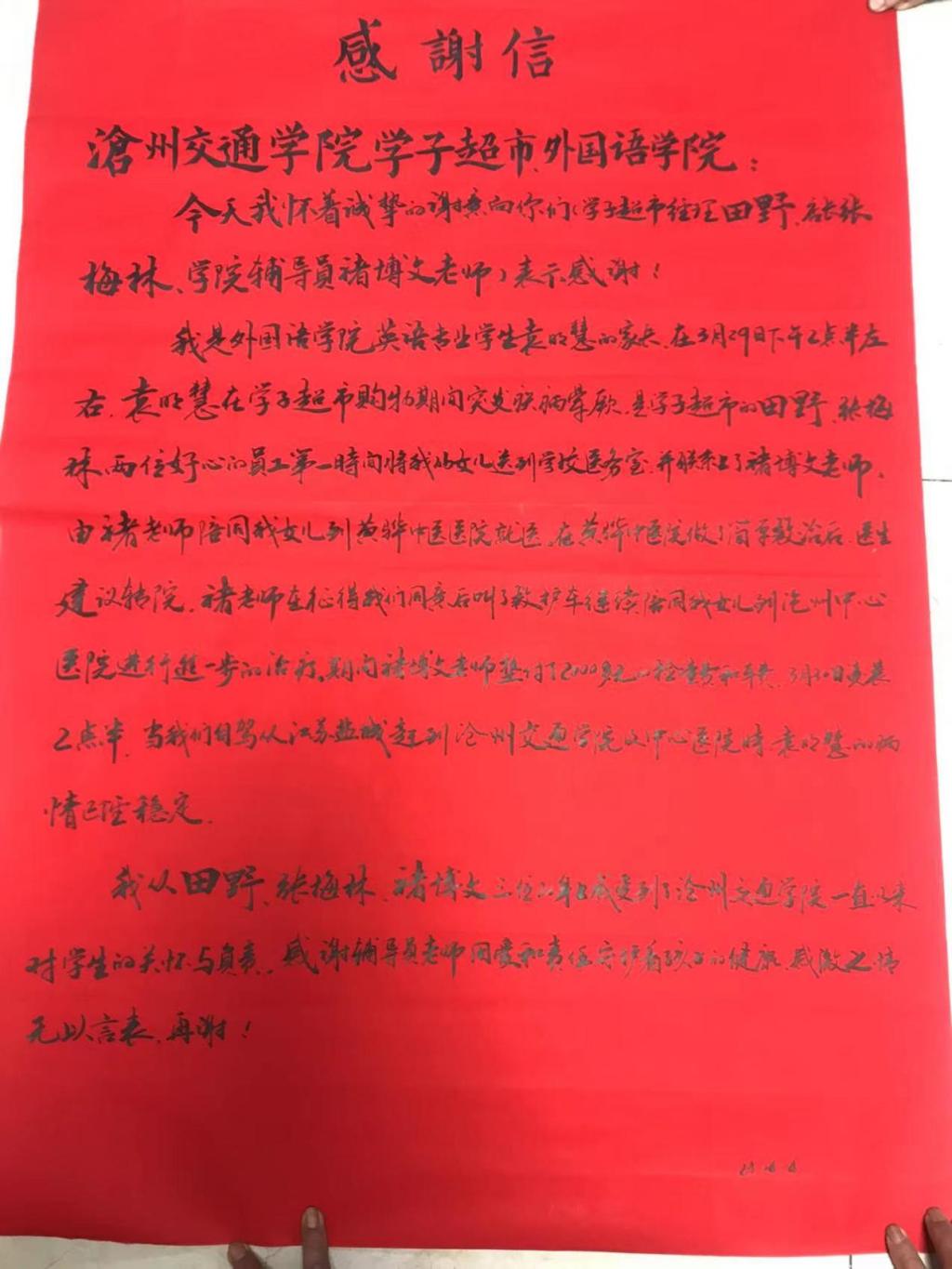 3月29日下午外国语学院袁明慧同学在学子超市购物时突然晕厥,学子超市店长张梅林和经理田野立即将袁明慧同学送到校医务室并联系上辅导员褚博文。褚博文老师在接到信息的第一时间,就陪同其到黄骅中医院。经过检查,中医院医生的建议转院,辅导员在在征得家长的同意之后,陪袁明慧同学坐救护车到沧州中心医院,到家长凌晨2:30赶到时,袁明慧同学的病情已经稳定好转。