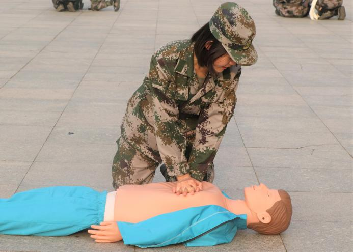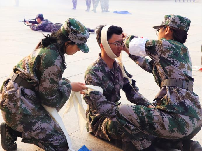 战地医疗救护充分模拟了真实战场的情况,烟雾四起,教官们高度警惕,救助手法十分熟练,充分展示了不抛弃不放弃、团结一心的精神。