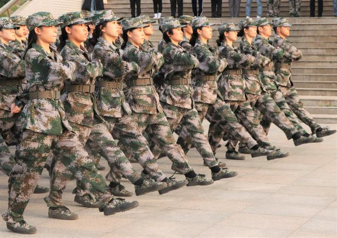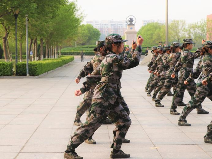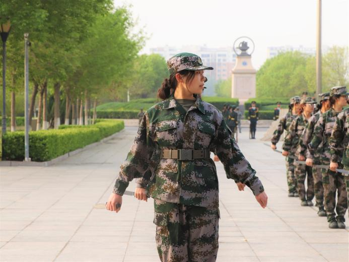 由女教官组成的匕首操方阵为我们展现出“女中自有豪杰在,巾帼岂肯让须眉”的精神。刀起刀落,每个动作都娴熟流畅。
