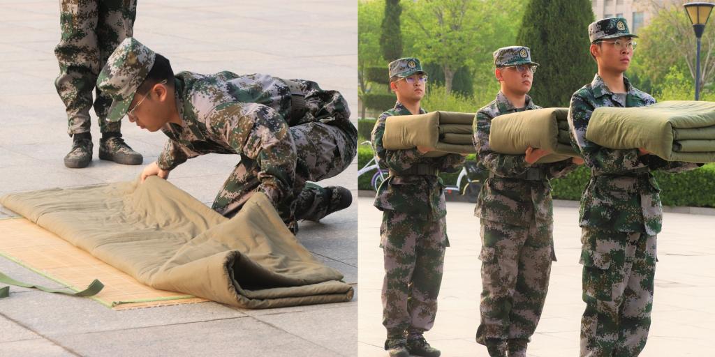 内务整理过程中,教官们的动作尽显流畅,一捏一折,叠出了整齐的“豆腐块儿”。