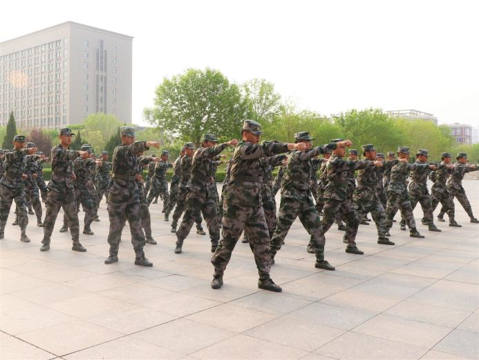 男教官们随着口令的下达,打出擒敌拳,气势如虹。行云流水的动作,犀利的目光和响亮的喊声充分展现出了他们的训练成果。