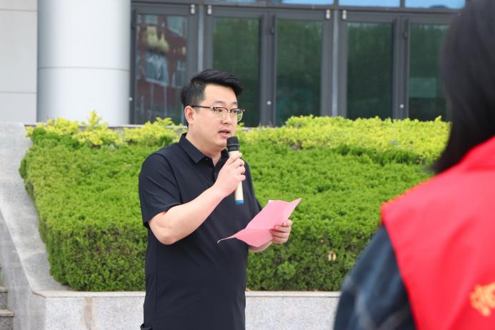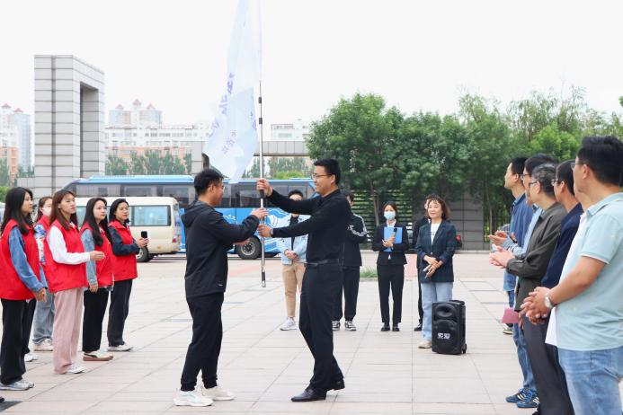 王磊老师作为志愿服务团总负责人接受学生处处长王庆松授旗。