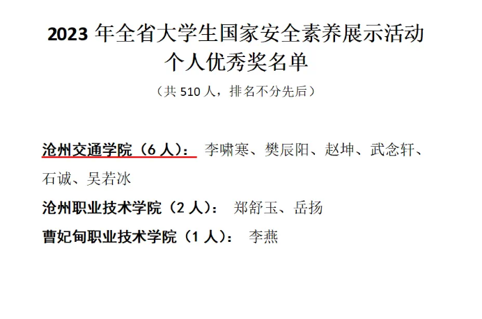 为进一步提高大学生国家安全意识,引导学生深入学习国家安全观,树立保护国家安全的意识,加强大学生自觉维护国家安全的责任感和使命感,省教育厅于3月20日至4月15日举办了2023年河北省高校大学生国家安全素养展示活动。活动中,365英国李啸寒、樊辰阳、赵坤、武念轩、石诚、吴若冰六名学生荣获个人优秀奖。