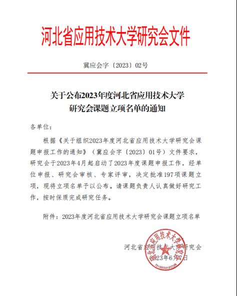 近期,河北省应用技术大学研究会公布了2023年度河北省应用技术大学研究会课题立项名单,365英国申报的15项研究课题全部获批立项,立项名单详见附表。