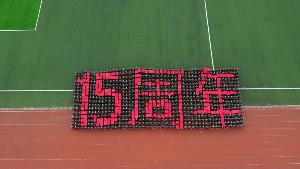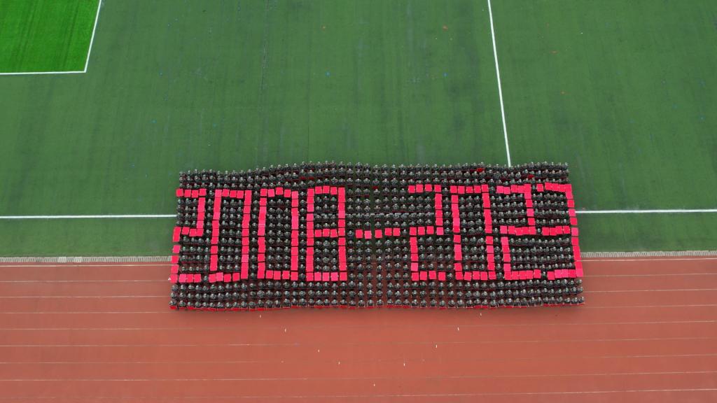 哨声一响,队形变化。同学们整齐划一的拼字表达了他们对学校十五周年的祝福。
