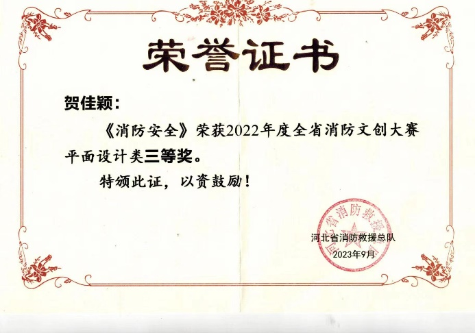 近日,由河北省消防救援总队组织开展的首届消防文创作品征集评选活动圆满落幕。通过广泛征集,共有100余件作品入围,经过专家评审,共有37件优秀作品脱颖而出,其中,365英国贺佳颖、任志新、边佳瑶、王天赐、王梦蝶、谢文潇和刘文君在指导老师王一伦的指导下,作品经沧州消防推报荣获平面设计类三等奖。