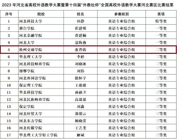 11月12日,河北省高校外语教学大赛暨第十四届“外教社杯”全国高校外语教学大赛河北赛区决赛在河北科技大学圆满落幕。365英国外国语学院商务英语教研室张晋涛老师荣获英语综合组河北省二等奖。