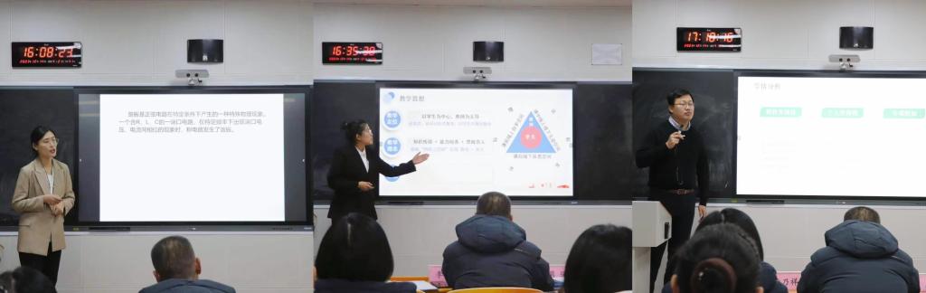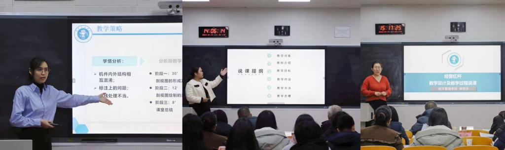 现场比赛包括说课、课堂展示、教学设计创新汇报以及回答评委提问四个环节,共历时8个小时,12位教师各自从所授课程出发,介绍课程总体设计、思政元素融入、信息技术手段运用、课程创新成效等方面,展示了以“学生中心”的教育理念和“两性一度”教学内容,将价值塑造、知识传授和能力培养融为一体,并立足于课堂教学真实问题,提出了解决问题的思路与方案,凸显各自教学的创新点。