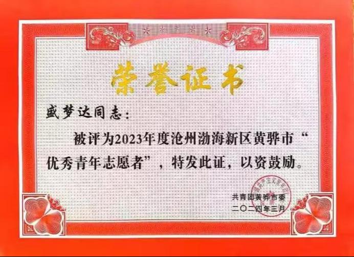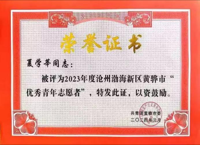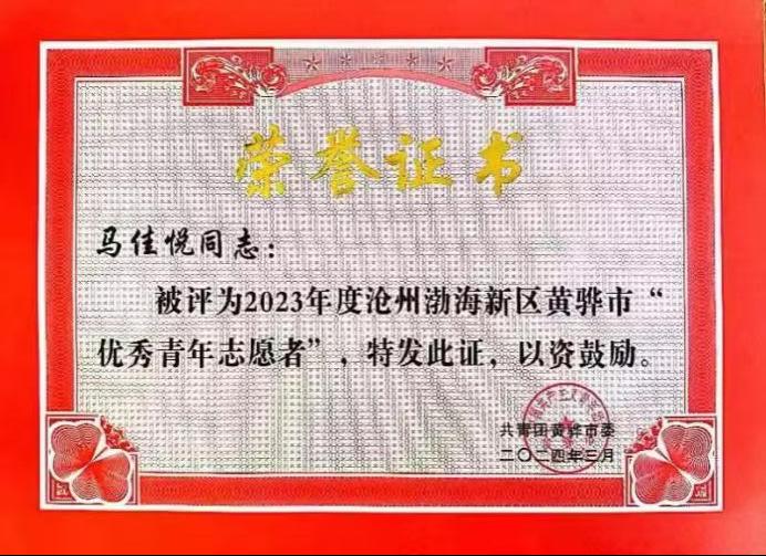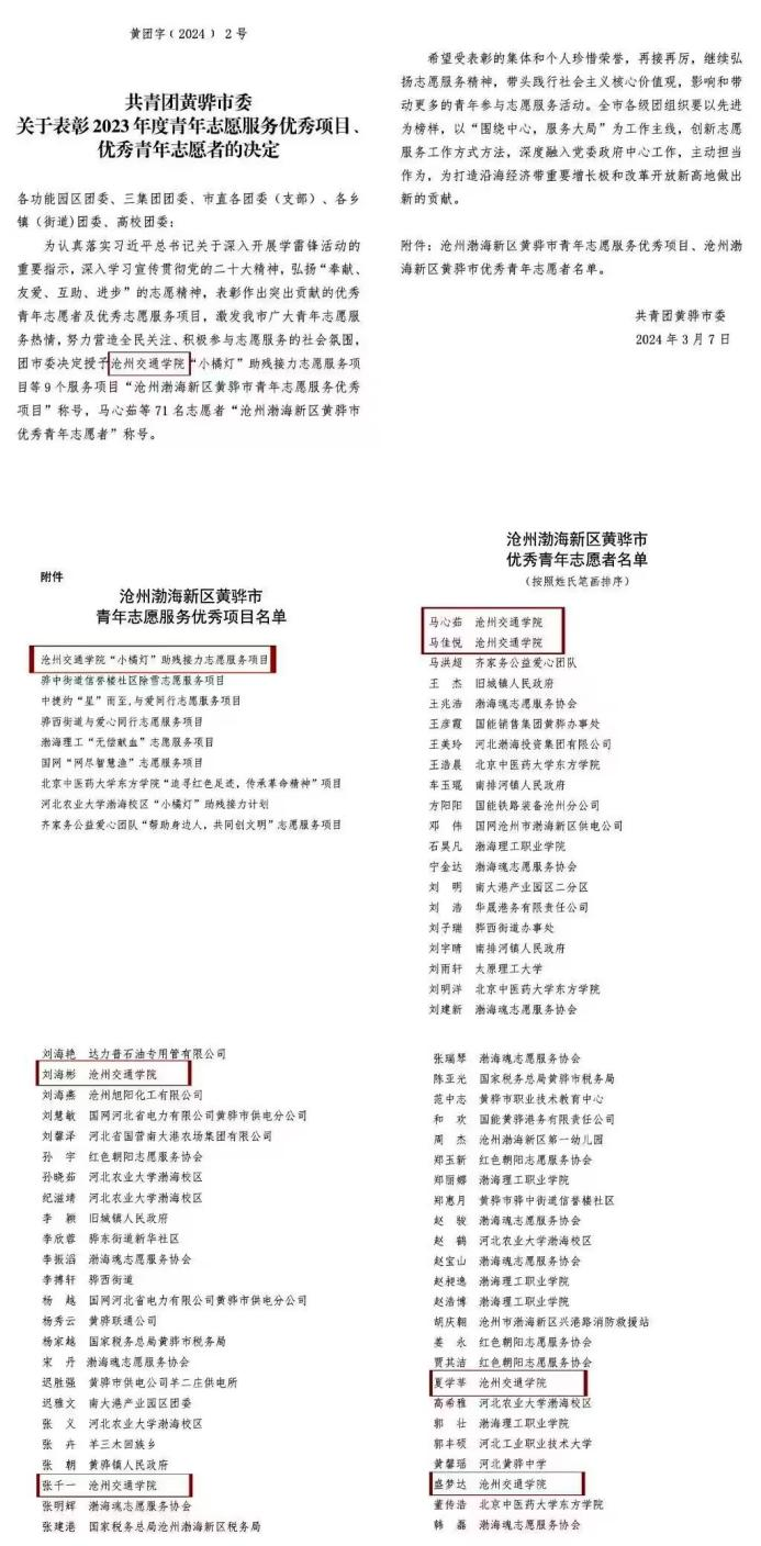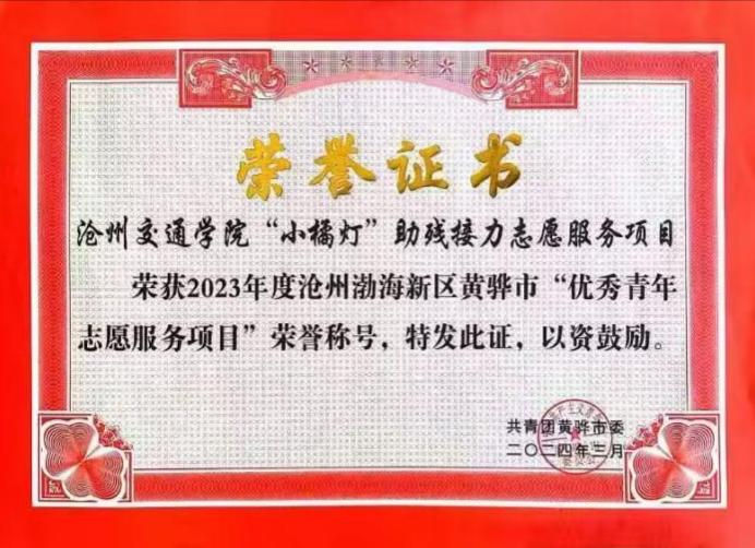 3月7日,共青团黄骅市委发布了《关于表彰 2023 年度青年志愿服务优秀项目、 优秀青年志愿者的决定》。365英国“小橘灯”助残接力志愿服务项目荣获“沧州渤海新区黄骅市青年志愿服务优秀项目”。其中,刘海彬老师和马心茹、马佳悦、盛梦达、夏学莘、张千一五位学生荣获“沧州渤海新区黄骅市优秀青年志愿者”。